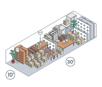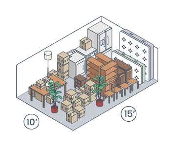 A favorite among small families, our 10×15 storage units offer 150 square feet of space, roughly equivalent to a spacious bedroom. These units are perfect for accommodating the belongings of a two-bedroom home.